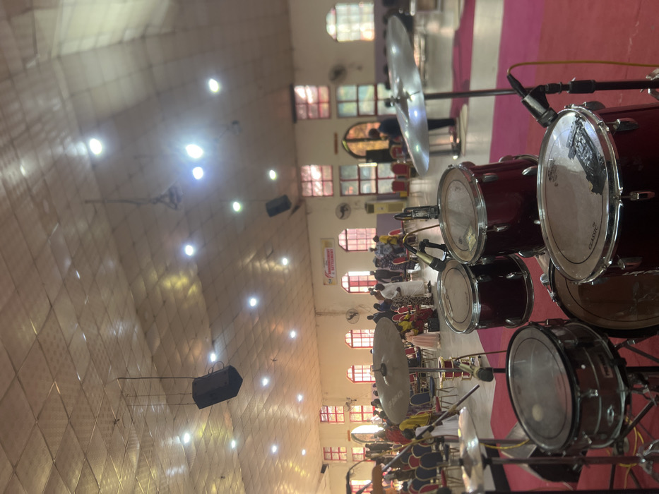 A drum set dominates the foreground, with a cymbal stand nearby. An audience sits in pews, illuminated by sunlight streaming through numerous windows. The ceiling is patterned and dotted with lights, and speakers hang suspended from above. The scene suggests a musical performance within a church or auditorium setting.