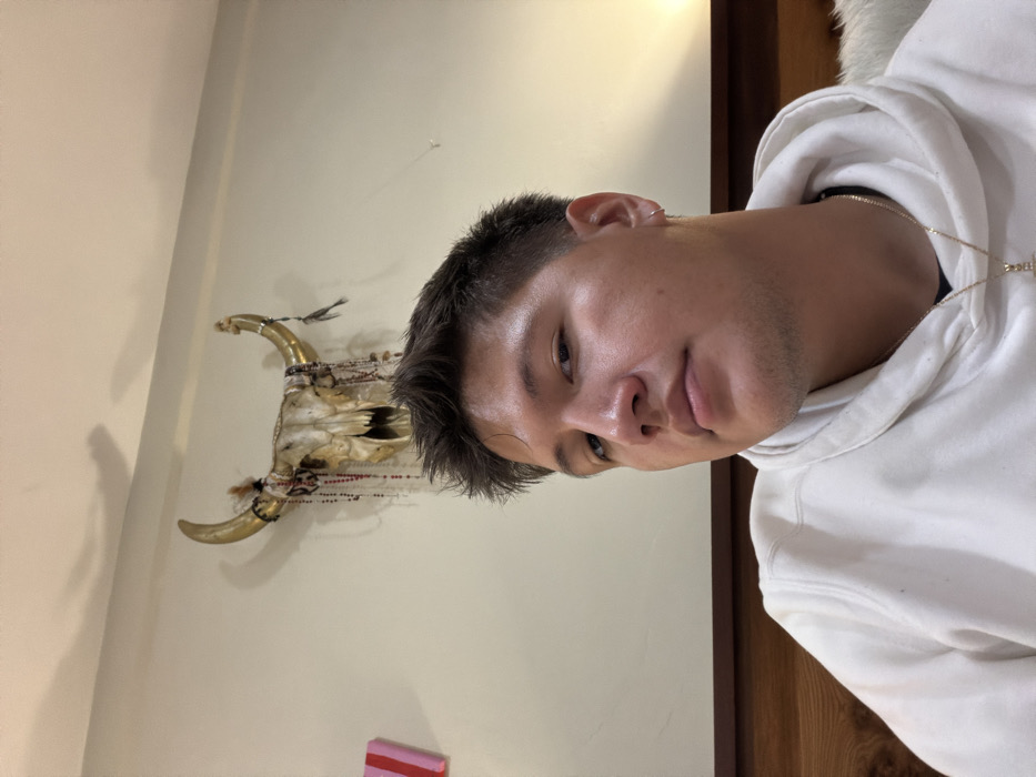 A young man with short dark hair, wearing a white hoodie and a gold chain with a cross pendant, poses in front of a wall. On the wall is a decorative bull skull with golden horns and various beaded embellishments. A small, rectangular, pink and red object is visible near the bottom of the frame. A wooden door frame is partially visible on the right edge of the image.