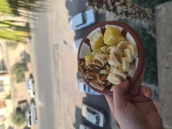 A human hand holds a ceramic bowl with a brown rim and white interior featuring brown vertical stripes. The bowl contains sliced bananas, several orange wedges, and whole walnuts. The scene is viewed from an elevated vantage point overlooking a street in Barza Municipality, Syria. The background is out of focus, showing multiple parked light-colored vehicles, including sedans and a minivan, lining both sides of the street. Distant residential buildings and sparse green foliage, including visible palm fronds on the right side of the frame, complete the environment under daytime lighting.