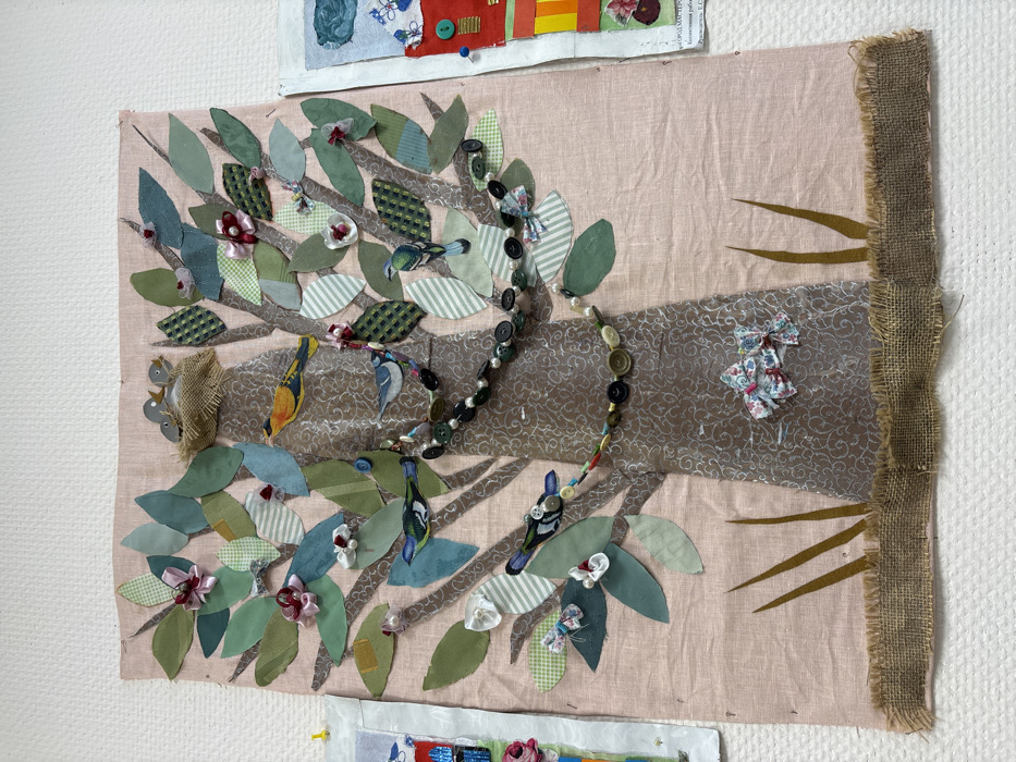This image displays a textile art piece, approximately rectangular and oriented vertically, set against a white textured background in Novosergievka, Russia. The central subject is an appliquéd tree, created from various fabrics, on a light pink fabric base. The tree trunk and branches are fashioned from a brown fabric featuring a subtle light-colored swirl pattern. Numerous leaves, made from diverse green, light blue, solid, striped, and checkered fabric pieces, are appliquéd onto the tree structure. Small fabric flowers, some accented with white pearl beads or simple bows, are distributed among the leaves. At the upper left, a small nest constructed from burlap-like material contains three light-colored bird figures with open beaks. Multiple multi-colored bird figures, also appliquéd from different patterned fabrics, are positioned on various branches. Two decorative garlands are draped across the branches: one composed of dark buttons and white pearl beads, and another of smaller, multi-colored beads and buttons. Near the base of the trunk, two small fabric bows with a floral pattern are attached. The bottom of the artwork features a horizontal strip of frayed burlap and several vertical brown fabric elements representing grass. Partial sections of two other textile art pieces are visible to the left and right of the central artwork, suggesting a display or collection.