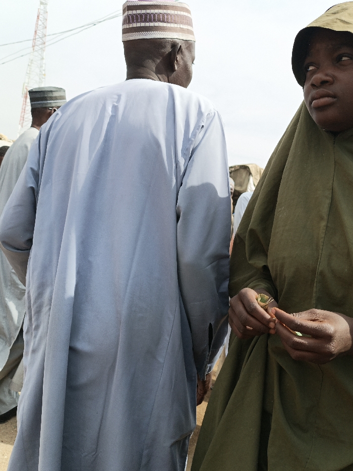 The image depicts an outdoor scene in Gama, Nigeria, featuring two primary individuals in the foreground and a busy background. On the left, a man is seen from the back and right side, wearing a light blue long-sleeved garment and a patterned striped cap in shades of brown and white. He faces generally away from the viewer. To his right, a younger individual, likely female, is partially visible from the chest up, oriented towards the right of the frame. She wears a dark olive green head covering and garment. Her face is visible in profile, looking upwards and to the right. Her hands are engaged in holding a small, light-colored, possibly leafy object. A prominent gold-toned ring with a green central stone and ornate design is on her right ring finger. In the background, other indistinct figures are present, including another man wearing a striped cap, suggesting a crowded public space. Structures resembling market stalls or tents are faintly visible. Dominating the distant background is a tall, red and white striped telecommunications tower against a bright, clear sky. The ground appears dry and unpaved.