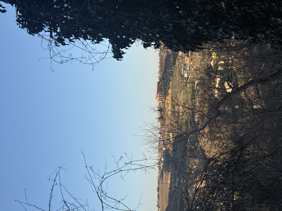 The scene presents an elevated panoramic view overlooking a valley within the city of Segovia, Spain. The foreground is heavily framed by a dark, dense mass of evergreen foliage on the right and a network of dark, silhouetted, leafless tree branches on the left and bottom, partially obscuring the view. The midground reveals a valley landscape featuring scattered residential buildings with predominantly red-tiled roofs, interspersed with numerous leafless deciduous trees and patches of green vegetation on undulating terrain. Linear elements, potentially power lines or agricultural trellises, are visible traversing some of the slopes. In the background, atop a distant, sunlit hill, a large building identified as the Parador de Segovia is prominent, characterized by its extensive terracotta-colored roofs and a series of distinctive arched structures. Surrounding hills show additional smaller buildings and general urban sprawl. The sky above is clear, bright blue, transitioning to a lighter shade near the horizon. The lighting indicates low-angle sunlight, illuminating the distant structures and hillsides with a warm glow, while some areas within the valley remain in softer light. No human figures or discernible activities are observed.