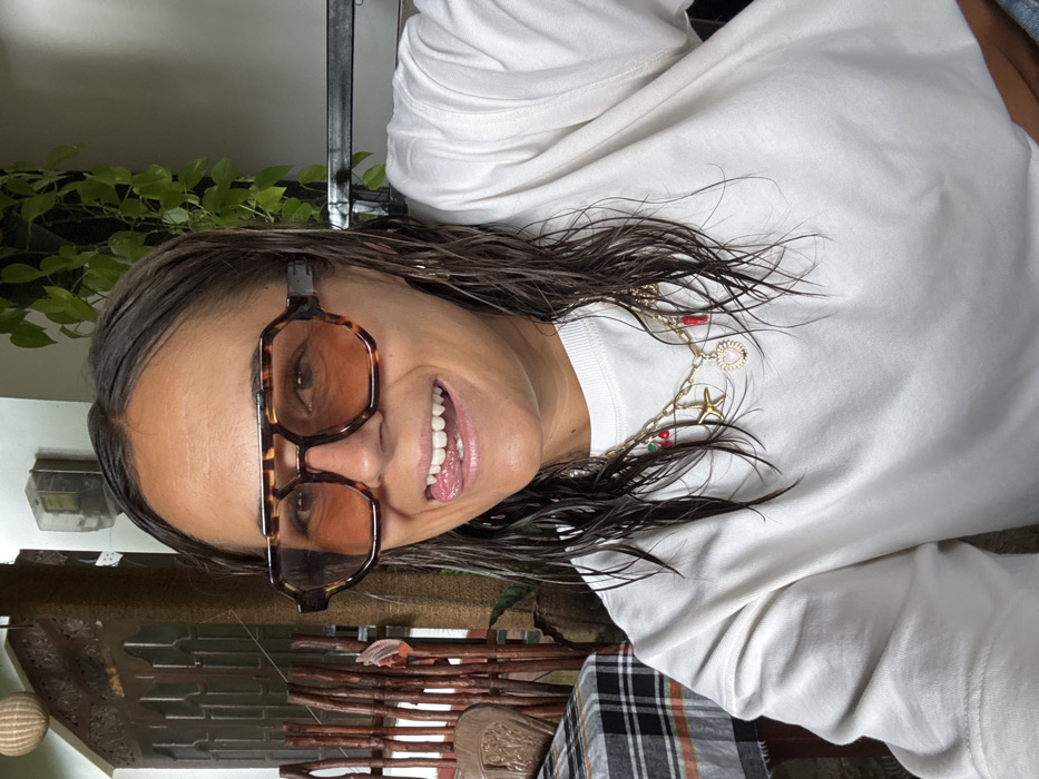 Nilwella, Sri Lanka. A close-up portrait depicts an adult female smiling, with her tongue extended to touch her upper lip. She has wet, dark hair and a tanned complexion. She wears tortoise-shell, double-bridged sunglasses with orange-tinted lenses, a white long-sleeved top, and a gold-colored chain necklace adorned with multiple charms, including a starfish, a pink heart, and red chili peppers. Small gold hoop earrings are visible. The background suggests an outdoor or semi-outdoor tropical environment, featuring a partially visible table with a white and dark plaid tablecloth on the left, vertical wooden or bamboo-like structures, a light-colored wall with carved architectural details, and an electrical box mounted on the wall. Green vining plants are visible on the right side of the frame, and a woven pendant light fixture hangs in the upper left background.