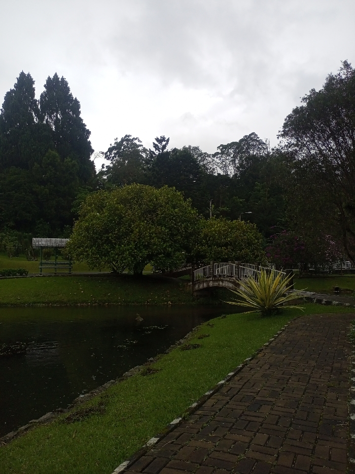 A park scene located in Beni, Nepal, is depicted under an overcast sky. The foreground features a dark body of water on the left, bordered by green grass. To the right, a paved pathway constructed from reddish-brown bricks extends into the distance, with a narrow strip of green grass separating it from the water. A spiky, variegated plant with green and yellow foliage stands on the grassy bank to the right of the water. In the midground, a small, white-railed arched bridge crosses the water. Beyond the water, on a grassy bank, a large, full-canopied green tree is situated near the bridge. To the left of this tree, a covered shelter with a green bench is visible. The background consists of a dense forest line with various types of trees rising into hills, extending to the horizon beneath the grey sky. No individuals, actions, or interactions are present in the scene.