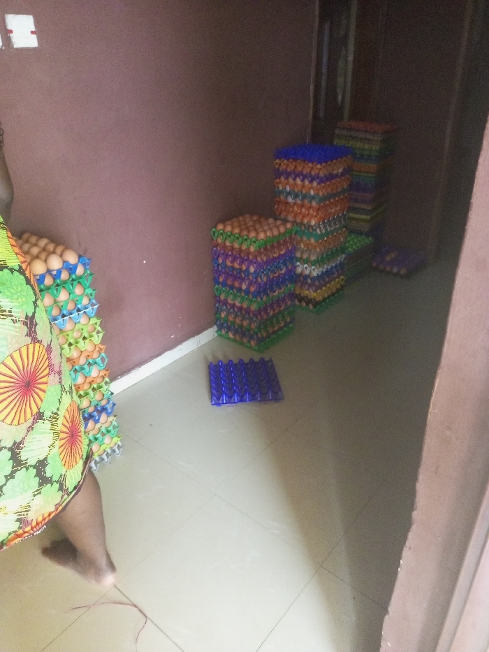 The image displays an indoor storage or retail area in Unknown, Unknown. A person is partially visible on the far left, wearing a vibrant green, orange, and yellow patterned garment, with their bare right foot on the light-colored tiled floor. To the left of the person, a stack of approximately ten to twelve colorful plastic egg crates, containing brown eggs in its upper layers, stands against a reddish-brown wall with a white baseboard and a white electrical outlet. Further into the scene, along the right side, multiple taller stacks of similar colorful plastic egg crates are visible, with several upper layers also containing brown eggs. Crate colors include blue, green, orange, and purple. One empty blue plastic egg crate lies flat on the light-colored tiled floor in the foreground, with another partially visible further back. The floor is composed of light-colored square tiles.