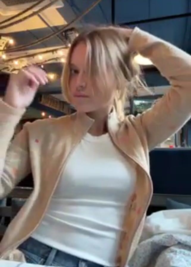 A young woman with light blonde hair is sitting at a table in what appears to be a restaurant or cafe