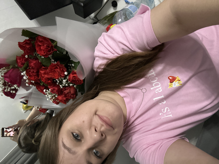 An image taken in Chaikovsky, Russia, depicts a woman posing for a selfie, partially obscuring the view with her right arm. The woman has long brown hair and blue eyes, and is wearing a pink t-shirt with "it's all about" printed in white text, below which is a graphic of a yellow cat holding a red heart. She also wears a thin silver chain necklace with a small circular pendant. To her upper right, a large bouquet of approximately two dozen red roses mixed with white baby's breath is prominently featured, wrapped in white translucent material and tied with a red ribbon. In the background, a mirror reflection shows the back of the woman's head, her hair secured in a ponytail with a gold-colored elastic, and her holding a smartphone, suggesting a mirror selfie. The reflection also reveals part of a yellow heart-shaped balloon. To the right, on a surface likely a table or desk, a plastic water bottle, a small blue clip, and a black electronic device are visible.