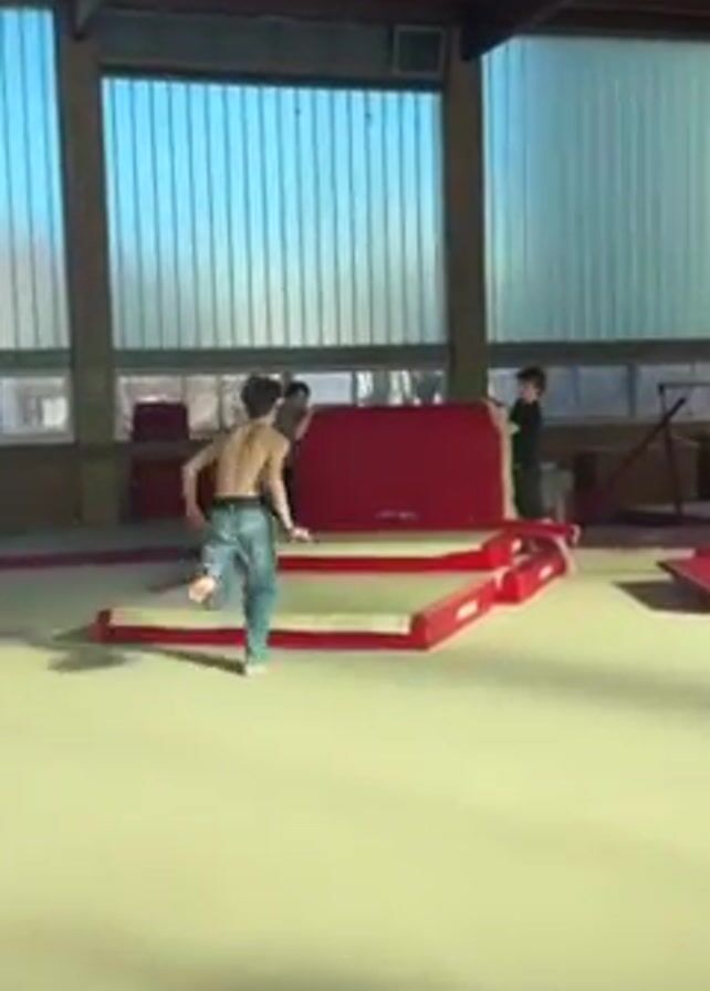 A young, shirtless person wearing jeans performs a backflip off of gymnastic equipment in a gymnasium. The individual runs towards stacked mats, jumps, and completes a backflip landing on the far side of the mats. Two younger people stand near the gymnastic equipment. The gymnasium has a high ceiling, and natural light streams in through windows behind the mats. Other gymnastic equipment is scattered around the perimeter of the gym. The gym floor is a light, solid color.