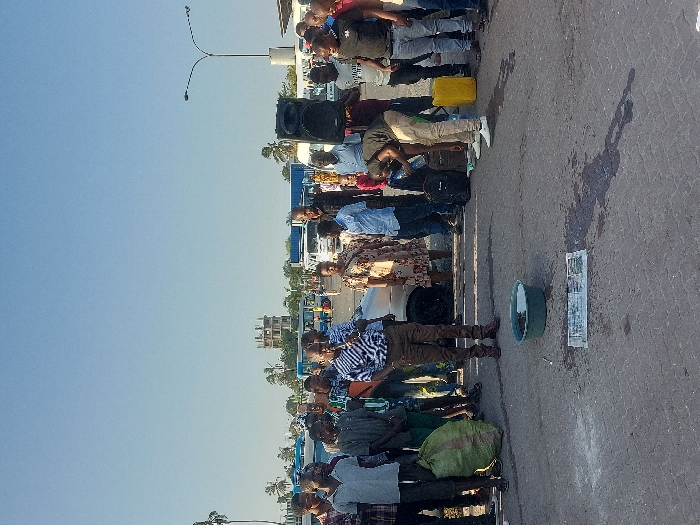 This image captures an outdoor public gathering at what appears to be a major bus terminal or transport hub in Dar es-Salaam, Tanzania, under a clear, bright sky