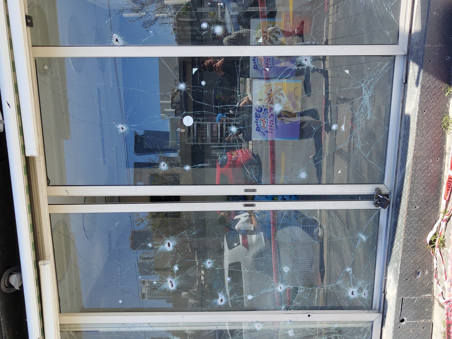 A street-level, full-frame forensic image depicts the exterior of a commercial storefront located in Givatayim, Israel. The facade consists of three large glass panels, with the two central panels forming a pair of double doors. All panels exhibit extensive damage, characterized by at least 20 distinct circular impact points surrounded by radial and concentric fracture patterns, consistent with ballistic or high-velocity projectile impacts. Despite the extensive fracturing, the glass remains largely intact within its white aluminum or PVC frames, suggesting safety glass. A dark padlock secures the base of the central glass doors. Below the windows, a metallic diamond plate surface serves as a platform or base. Red and white warning tape, similar to crime scene tape, is visible on the ground directly in front of the storefront. Reflections on the glass panels provide context of the surrounding urban environment under a bright sky, including distant modern high-rise buildings and various vehicles, such as a white SUV reflected on the left and a red vehicle on the right. Several individuals are reflected: one on the far left wearing a light-colored top and a face mask; a person centrally positioned, likely the photographer, holding a mobile device; and another individual to the right wearing a checkered shirt and red footwear. Reflections of additional Hebrew signage, including "פירות וירקות" (Fruits and Vegetables) and instances of red and white "שטח סגור" (Closed Area) tape, are also apparent on the glass. Above the storefront, a white retractable awning is partially visible, and a security camera is mounted.