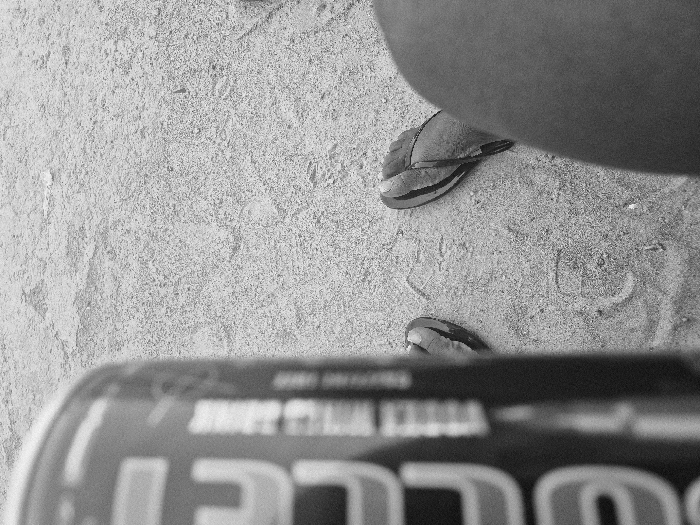 A grayscale, high-angle shot shows a portion of a person's leg wearing flip-flops, positioned on a coarse, sandy surface. A can, heavily cropped and blurred, occupies the lower part of the frame, obscuring a clear view of the foreground. The texture of the ground contrasts with the smoother surface of the leg and footwear. The can appears to have printed text. Overall, the composition creates an intimate, casual perspective, potentially capturing a moment outdoors.