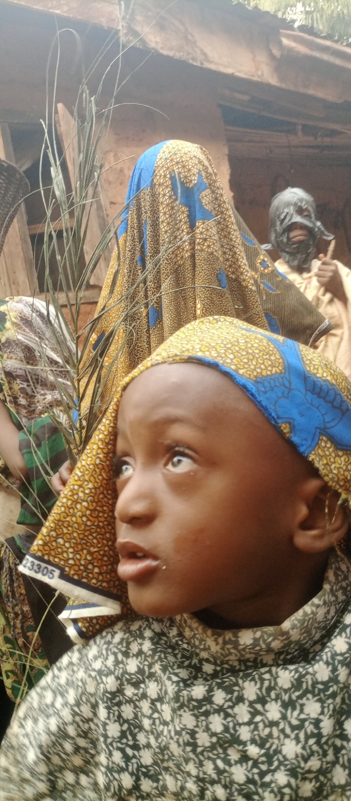 A child with a blue and yellow headscarf looks upwards with wide, light eyes. Behind them stands a person draped in a similar patterned cloth. To the right, a figure with a covered face raises a thumbs up. The scene appears to be outdoors, possibly near a rural structure. Blades of grass or reeds are prominent in the foreground, adding to the naturalistic feel of the image. The child's expression suggests curiosity or awe.