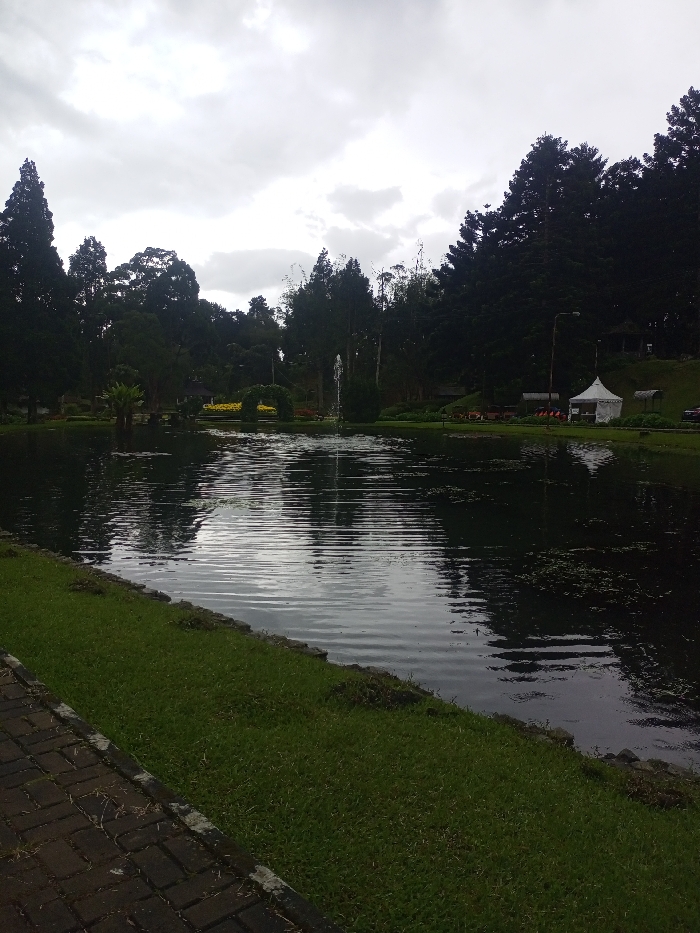 The image depicts a tranquil, overcast daytime scene within a landscaped park setting, presumed to be in Beni, Nepal. A large, dark body of water occupies the midground, featuring a central active fountain spraying water vertically. The water's surface exhibits ripples and reflects the overcast sky, with scattered patches of aquatic vegetation visible, particularly on the right. The immediate foreground on the left consists of a meticulously manicured grassy bank bordering the water, alongside a dark red brick-paved walkway. The water's edge is delineated by small, dark stones. Beyond the water, the background is characterized by dense, dark green foliage comprising a variety of tall trees, including numerous conifers. On the far side of the water, in the central-left, a green archway adorned with plants stands over what appears to be a landscaped garden area with visible yellow flower beds. A small palm-like tree is also present near the left bank. On the right side of the image, rising uphill from the water's edge, more dense tree cover is visible. A white, pointed tent structure is erected on a grassy slope, with a dark streetlight pole positioned nearby. Further up the slope, among the trees, a dark-roofed gazebo or open-sided shelter is present. A dark-colored vehicle is partially visible on the far right, near the tree line. No individuals are present within the frame. The sky is uniformly overcast, indicating diffused lighting conditions.
