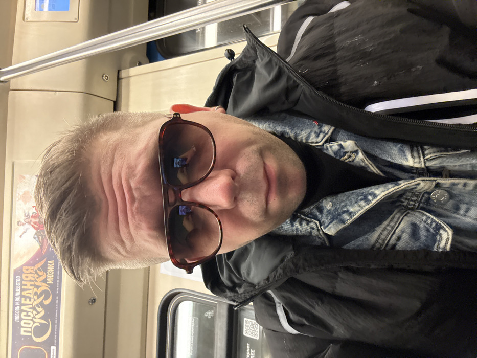 A selfie captures a man on public transport, possibly a subway. He wears brown-tinted sunglasses, a black top, a light-colored denim jacket, and a dark-colored windbreaker or jacket. The background shows the interior of the subway car, including a poster with Russian text and colorful illustrations. The car's surface appears beige with darker fixtures. A QR code is visible on the wall. The man's expression is neutral.