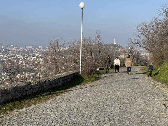 The scene depicts a cobblestone pathway on an elevated hillside in Plovdiv, Bulgaria, offering a panoramic view of the city