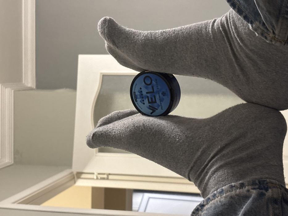 The image depicts a close-up, low-angle view of an individual's lower legs and feet indoors. The subject's feet are clad in grey, somewhat worn socks, exhibiting minor pilling. A segment of blue denim jeans is visible at the lower leg portion on both the left and right sides of the frame. Between the two feet, which are positioned with the soles facing each other, a round blue container of "VELO Peppermint Storm" nicotine pouches is held upright. The background reveals an indoor residential or commercial space. A wall painted in a light greenish-grey hue is visible, topped with white crown molding. To the left, a white doorframe opens into another room with a lighter, possibly yellow, wall. A white door with a decorative glass panel is partially visible in the center-right of the background. The specific location within the city of Plovdiv, Bulgaria, cannot be determined from the visual information provided in the image.