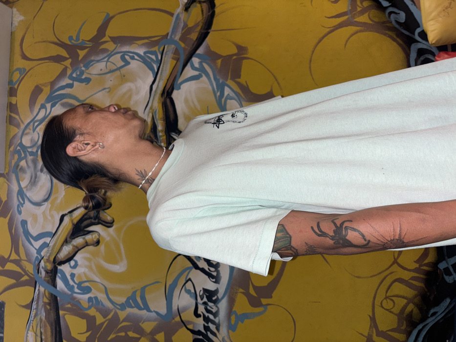 A person is depicted in a profile medium shot, facing right, against a brightly painted wall in ตำบลเกาะพะงัน, Thailand. The individual, appearing male with dark skin and dark hair styled in a bun, wears a light mint green, short-sleeved t-shirt. The shirt features a black graphic logo on the left chest, identifiable as a 'Stussy' mark above a stylized figure. A white twisted cord necklace and two silver hoop earrings are visible. Tattoos include a prominent black spider-like design on the outer right forearm, a radiating pattern below it, and a distinct cannabis leaf outline on the left side of the neck. The background wall is painted a vibrant yellow, adorned with a graffiti-style mural featuring elements reminiscent of Michelangelo's 'The Creation of Adam,' specifically two hands reaching towards each other, executed in shades of yellow, black, brown, and light blue. Black graffiti lettering, partially obscured by the subject, reads "thica da..." below the hands.