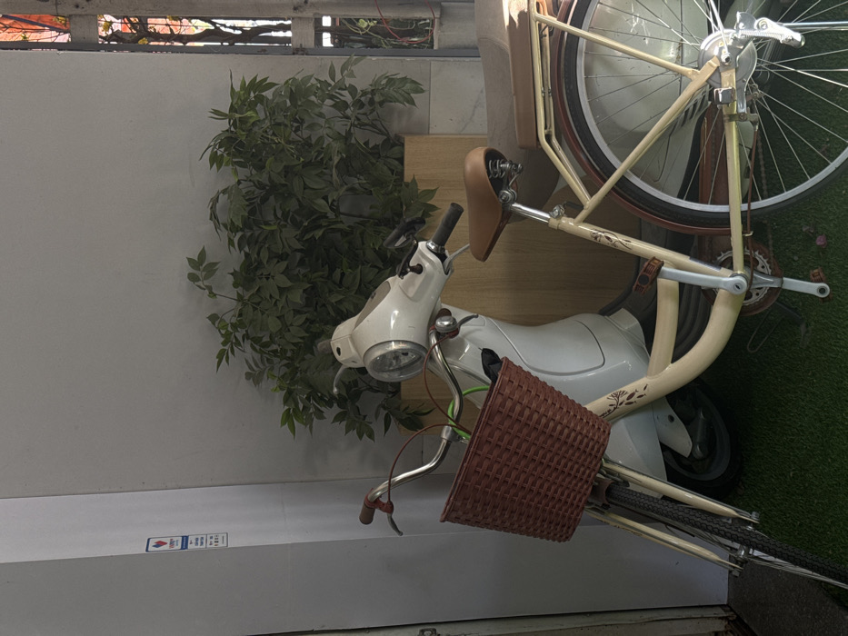 A white scooter stands near a lush green plant, next to a beige bicycle with a brown seat and a woven basket attached to the handlebars. The scene is partially obscured, with the bicycle wheel dominating the upper right. The scooter is positioned vertically, while the bicycle is tilted. The background features a white wall and a glimpse of what looks like artificial grass.