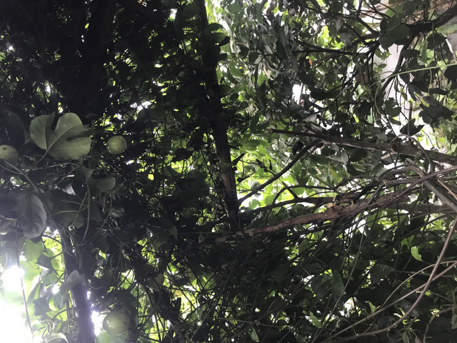 The image presents a dense overhead canopy of passion fruit vines (*Passiflora* species) in an outdoor botanical setting in Bogor, Indonesia