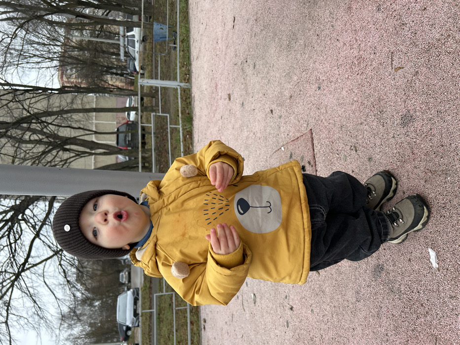 A young child wearing a brown beanie, yellow bear-themed coat, dark pants, and grey hiking boots stands on a pink surface outdoors. The child is making a surprised or playful expression with their mouth open and hands raised slightly. In the background, bare trees and a building are visible, alongside a metal fence and parked cars. The day appears overcast.