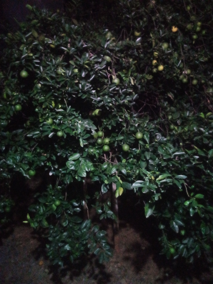 A lush, dark green tree is laden with round, green fruits, possibly citrus. The leaves are dense and abundant, creating a thick canopy. Some fruits show a hint of yellowing, indicating ripeness. The photo is taken at night, with limited lighting, casting deep shadows. The ground beneath the tree is barely visible, blending into the darkness.