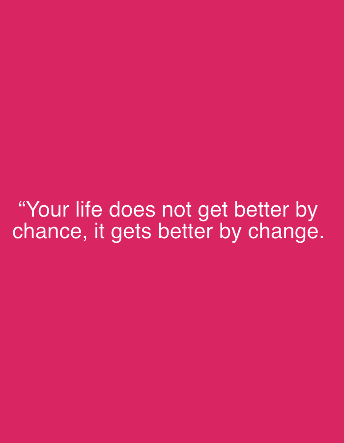 The image is a simple text-based graphic featuring a motivational quote. Against a solid pink background, the quote reads: "Your life does not get better by chance, it gets better by change." The text is white and appears to be centered on the image, creating a clean and straightforward design. The message emphasizes the importance of personal change as the key to improving one's life, rather than relying on luck or circumstance.