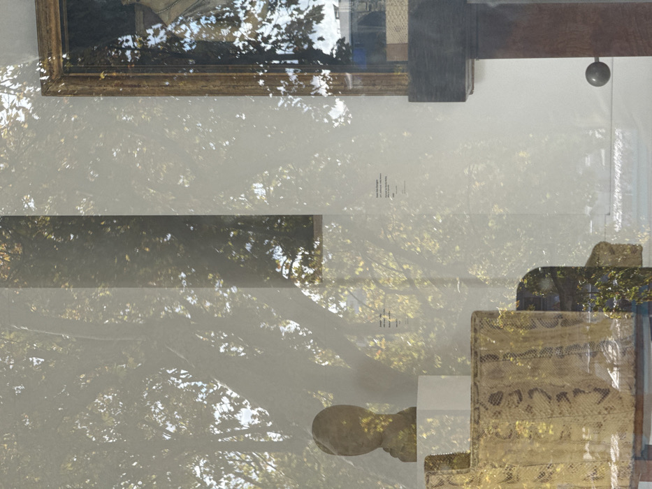 This image depicts an interior exhibition space viewed through a large window, creating a layered composition with significant reflections of the exterior environment. The location is the Musée d'Art Moderne de Paris (MAM Paris), France, situated near Avenue du Président Wilson. Inside the exhibition, a light-colored, possibly stone, bust of a human head and shoulders rests on a white rectangular pedestal in the left foreground. Below and slightly right of the bust, a chair upholstered in a material with a distinct snakeskin-like pattern, predominantly beige and brown, is visible. On the light-colored wall behind these objects, two informational plaques are affixed. The left plaque identifies a "Chaise 'Transat'" from "1930" by "Henry van de Velde" (Belgian, 1863-1957). The right plaque identifies "Femme aux bijoux" (Woman with jewels) from "1905" by "Kees van Dongen" (Dutch, 1877-1968). To the far right, a large painting with an ornate, gilded frame is prominently displayed, depicting a figure partially visible through reflections. Below the painting, a dark, horizontal mantel-like structure and a reddish-brown wooden panel with a round metallic handle are present. Dominant reflections on the window glass obscure parts of the interior scene. These reflections primarily show numerous green and yellow tree leaves and branches, indicating mature deciduous trees outside. Patches of bright sky are visible through the foliage, suggesting clear weather. A faint, tall, rectangular reflection, possibly another window or building facade, is discernible near the center. The reflections suggest the museum faces a tree-lined street or park area typical of central Paris.