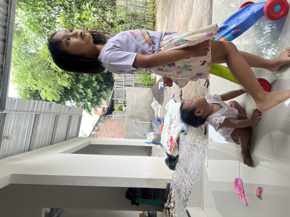 Two young girls are in a patio area. The older girl stands near a blue and red push walker, gazing up and to the left. She wears a white shirt and a printed skirt. The younger girl sits on the tiled floor looking up at the older girl and holding onto her leg. The house structure frames the left side of the image. Foliage, buildings, and a wall are visible in the background.