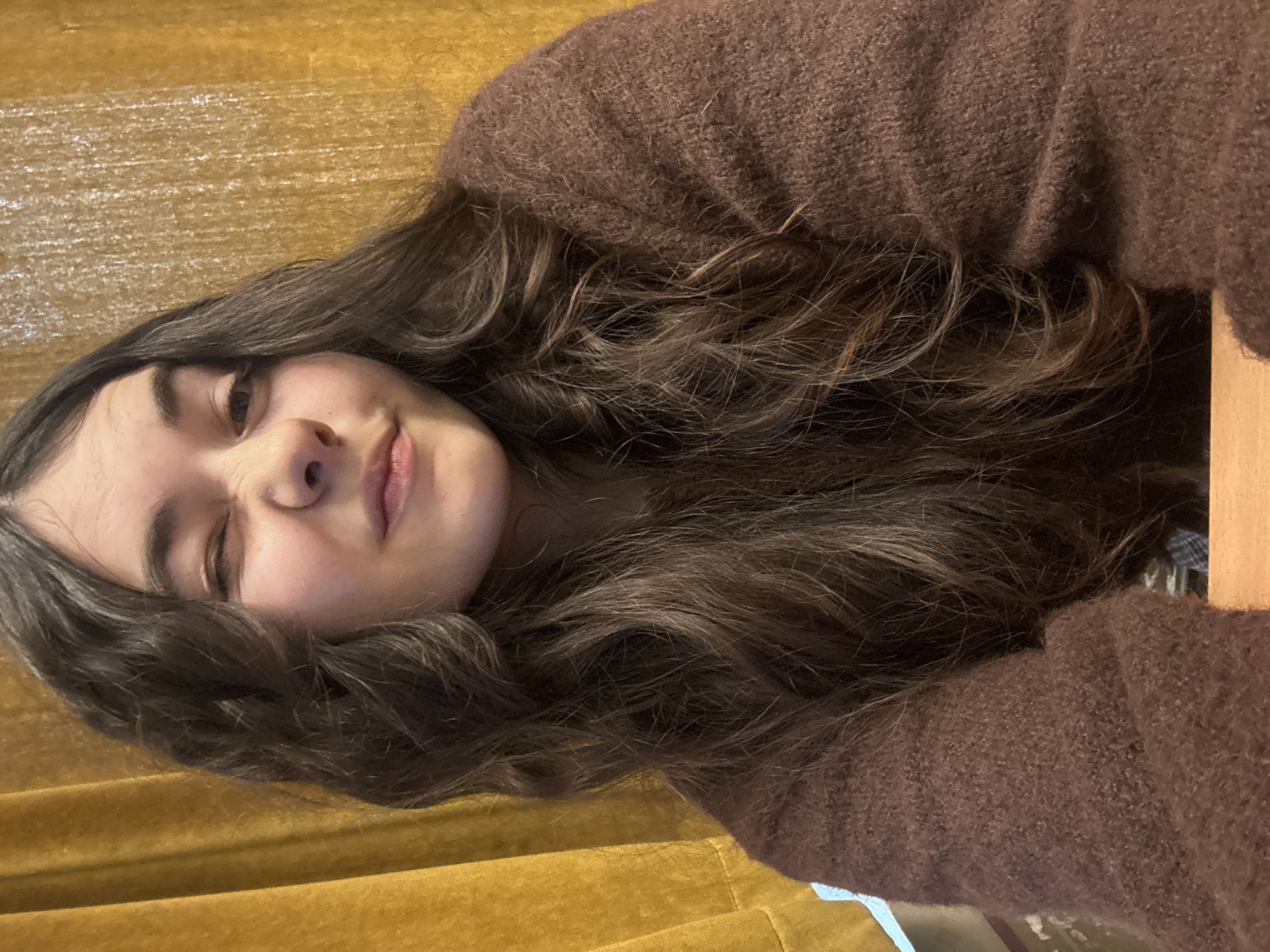 A person is shown in a close-up, rotated portrait shot. The person, likely a female, has medium-length, wavy brown hair with some lighter strands. She is wearing a brown, textured sweater. The background appears to be a golden-yellow fabric or surface. The person has one eye closed in a wink, and a slight smile. The location is not discernable to be Plovdiv, Bulgaria, based on the image.