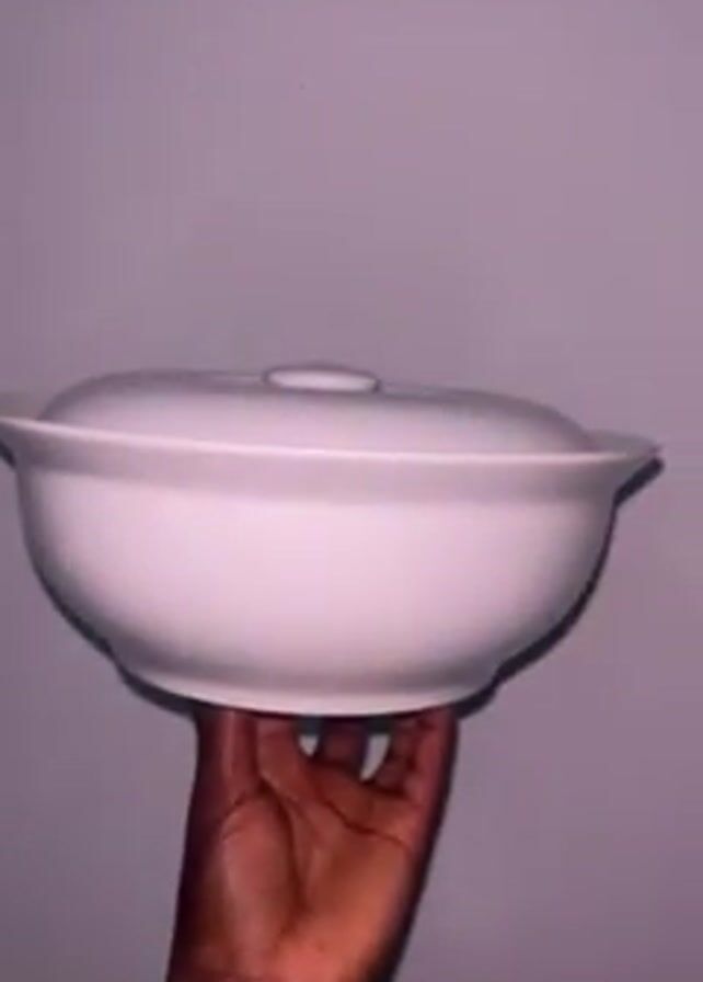 A hand with dark skin is holding a white, lidded bowl. The background is a light purple-gray wall. The hand moves the bowl slightly. The bowl has a round shape with handles on each side and a lid with a small knob. The lighting is even.