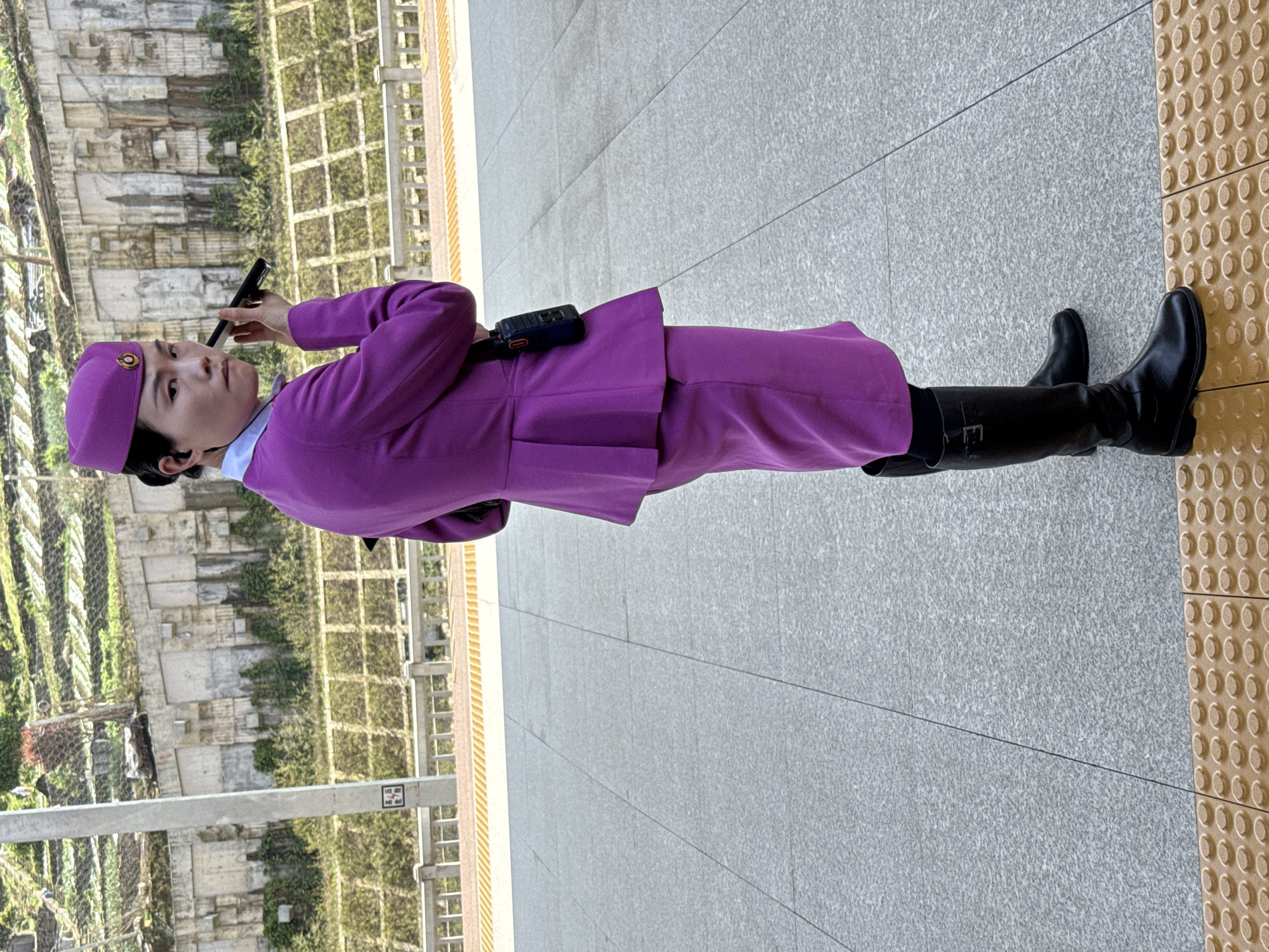 A woman stands on a platform in Wulong District, China. She wears a purple uniform, a matching purple cap, and black boots. The platform has a textured yellow edge. The woman is holding a black object to her mouth, possibly a communication device. Behind her is a view of railway tracks and some greenery, suggesting an outdoor railway station environment. The platform surface is a light grey, tiled texture.