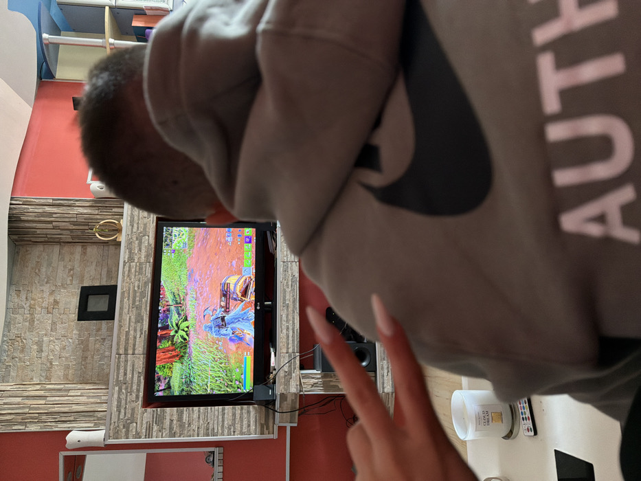 The image displays an indoor scene within a residence in Vidin, Bulgaria. A male individual is depicted from behind, seated and facing a television. He wears a gray hooded sweatshirt featuring a large black Nike swoosh logo on the back, with the partial word "AUTH" visible below it. His hair is short and dark. In the immediate foreground, a left hand, exhibiting long, light-colored polished fingernails, is making a two-finger "V" or peace sign. This hand is positioned in front of the seated individual's right shoulder. The central focus is a black LG flat-screen television displaying a video game. The game interface shows a blue-clad character standing near a wooden chest in a brightly colored outdoor environment with green foliage, trees, and reddish-brown terrain. A game's graphical user interface is visible at the bottom of the screen. The television rests on a multi-tiered entertainment unit constructed from light-colored stacked stone or tile. Two black speakers are positioned on this unit, one on each side of the television. Above the television, a black square decorative object is set into a recess within the stone facade, accompanied by a small golden circular ornament and a white rectangular item on the upper shelf. The room's walls are painted a prominent red-orange color. On a white surface in the foreground, a white candle in a clear glass jar labeled "CLOUD DREAM" and a multi-colored remote control are visible. In the upper right background, a light-colored, multi-tiered shelving unit is partially visible.