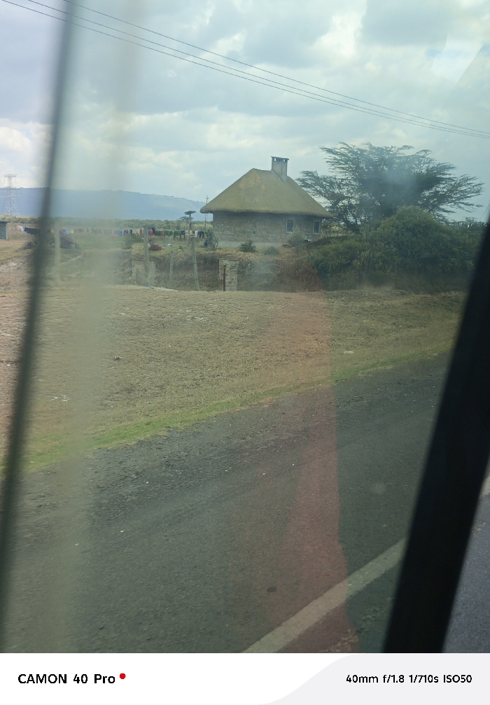 The scene depicts an outdoor rural landscape in Malewa West ward, Kenya, viewed through a reflective window. A single-story structure with stone walls, a prominent conical thatched roof, and a stone chimney is centrally positioned in the midground. Two windows are visible on its façade. To the left of this house, colorful laundry hangs on a clothesline in a dry, grassy field. This area is delineated by a rudimentary fence and two stone gateposts. Further left, a smaller building with a corrugated iron roof is partially visible. A large, spreading tree stands behind the main house, accompanied by smaller bushes. Overhead, multiple parallel utility lines traverse the sky, and a power pylon is identifiable on the far left horizon against distant hills. The foreground consists of a dark, likely gravel or asphalt road, bordered by a strip of dry and green grass. The sky is partially cloudy. No individuals are visible.