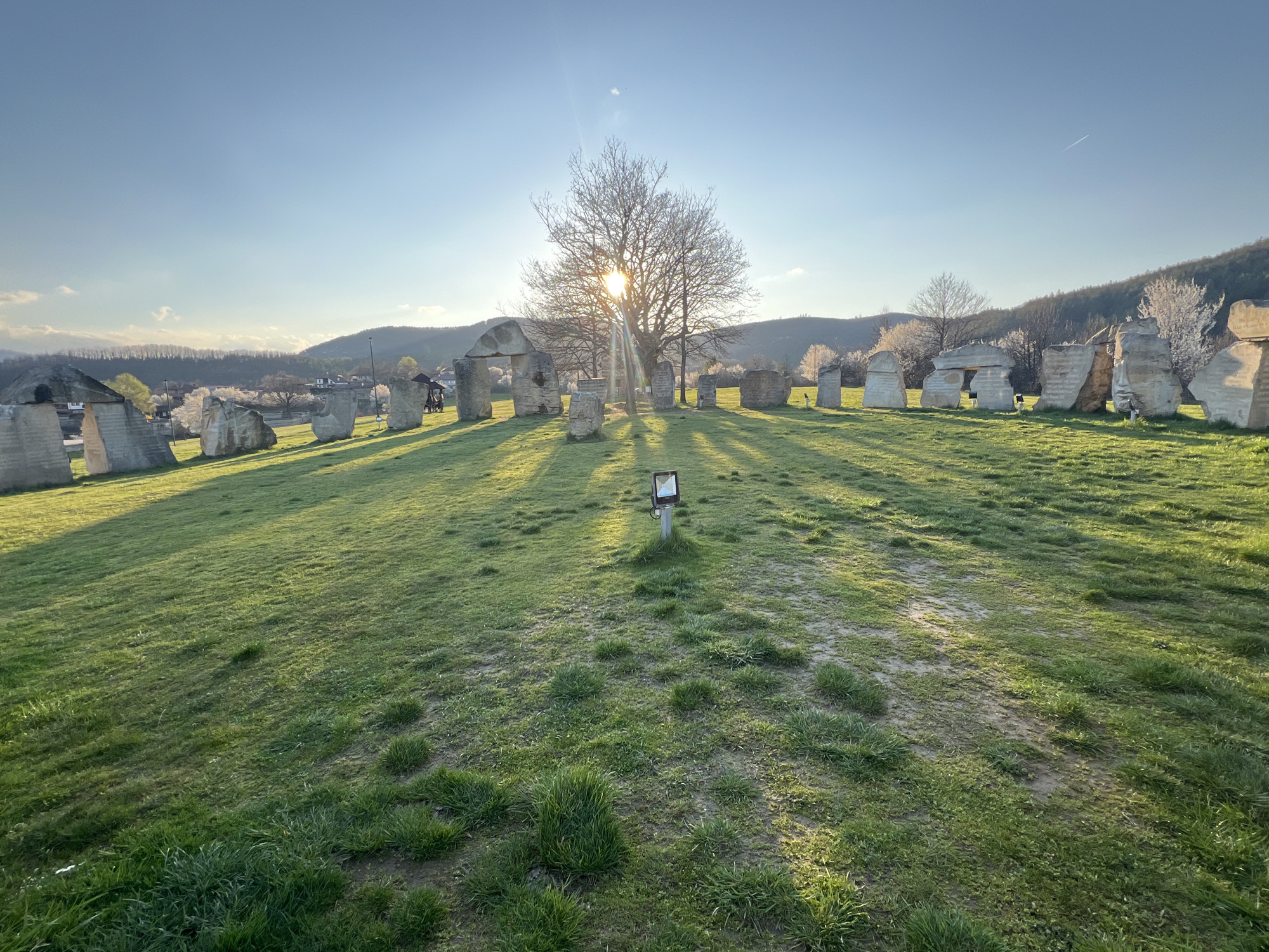 stone circle monument located in Gardevtsi, Bulgaria. The monument consists of upright stones, some with archways, arranged in a circular pattern on a grassy field. In the center of the circle, there is a bare tree with the sun partially obscured behind its branches. There's an informational sign on a post in the foreground. In the background, there are rolling hills and some buildings, indicating a rural or semi-rural setting. The sky is blue and clear. The lighting suggests it is either sunrise or sunset. There are no people visible in the image except near the left side of the circle with the stones.