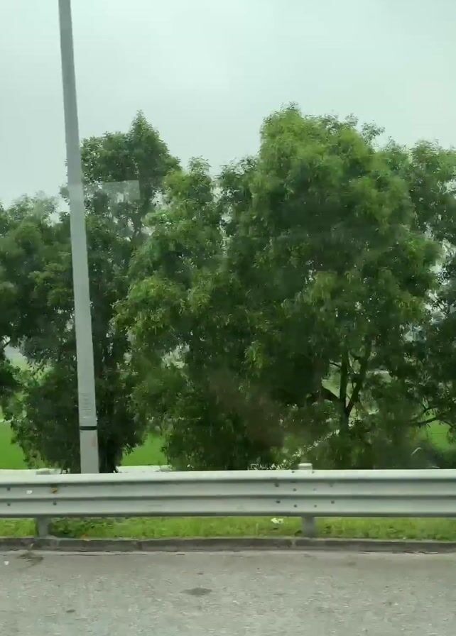 The video depicts a view from a moving vehicle. The foreground is dominated by a gray asphalt road marked with a solid white line, and a gray metal guardrail separating the road from the adjacent area. Beyond the guardrail, there are green trees with visible foliage, standing between the road and a bright green field. The sky is overcast and gray. The camera remains static within the moving vehicle, capturing the passing scenery. There are no people visible in the scene.