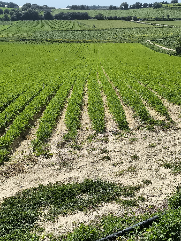 The image displays an expansive agricultural landscape under a clear, bright sky in a rural area of Unknown, Unknown. In the foreground, a section of sandy soil supports patches of wild green vegetation, with a black irrigation pipe partially visible at the bottom right. Directly above, neat, parallel rows of young, vibrant green crops, consistent with root vegetables like carrots, extend into the middle ground. Small, black irrigation sprinkler heads are intermittently spaced within these crop rows. The surrounding soil between the rows is light brown and appears dry. The mid-ground reveals further agricultural fields containing various crops, planted in distinct linear patterns and differing shades of green. A winding, light-colored dirt path is discernible on the right side of the middle ground, traversing these fields. The background features a distant treeline composed of dense dark green foliage, with a faint light-colored structure barely visible to the left. A clear, pale blue sky occupies the top portion of the frame. No individuals, animals, or active machinery are present in the scene.