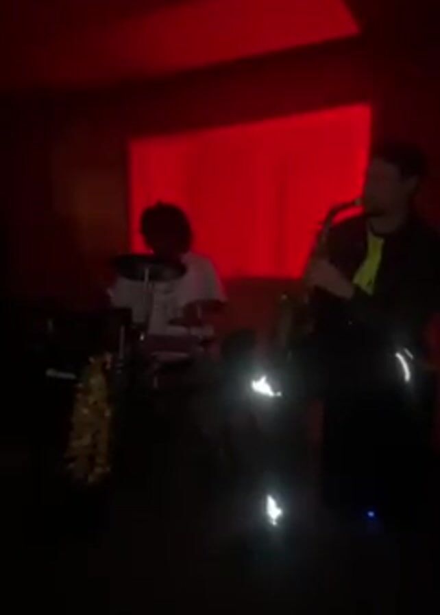 room with red lighting where a band is playing music. A person is playing the saxophone, another is on the drums, and a third is playing a bass guitar. A few other people are in the room as well, and the camera moves around a bit.