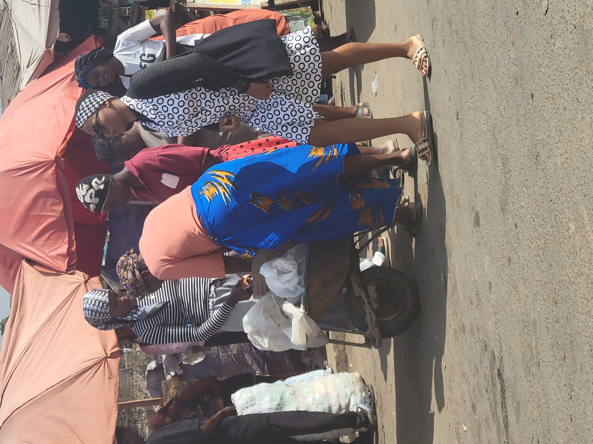 A street scene in Madalla, Nigeria, shows a woman pushing a wheeled cart along a paved road. The cart contains packages wrapped in white plastic. A woman in a blue skirt and orange shirt is pushing the cart. Several people stand adjacent to the cart and woman. A red sun umbrella provides shade.