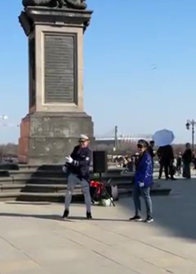 Two people in captain hats are dancing in a public square on a sunny day. They are wearing sunglasses and jackets, and they are dancing to music playing from a small speaker. Behind them is a tall monument, a large stadium, and other people walking around. Bubbles are floating in the air.