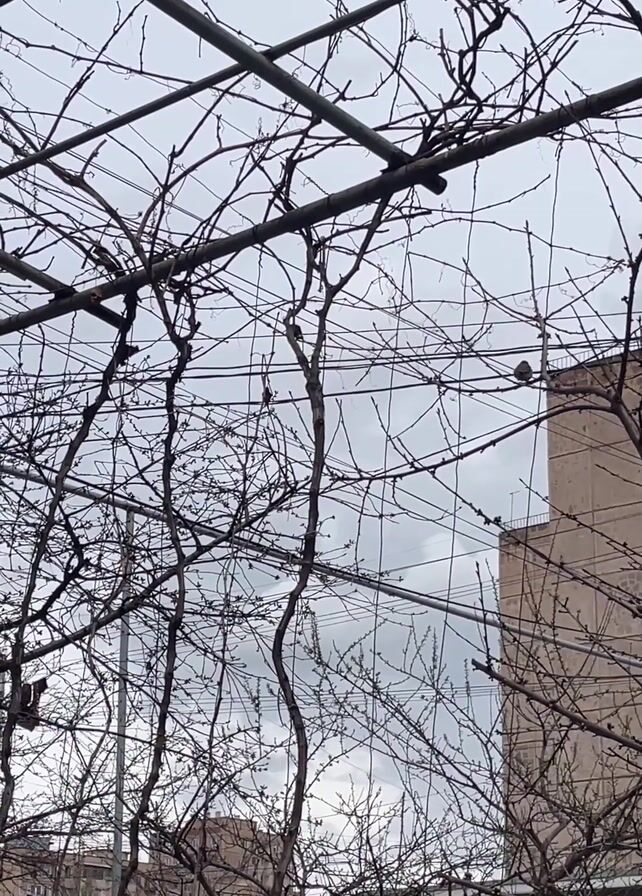 view through a network of bare tree branches and a metal trellis against a cloudy sky. In the background are buildings, one appearing taller and more prominent. Two small birds are perched on a wire running through the branches. The overall scene gives an impression of late winter or early spring.