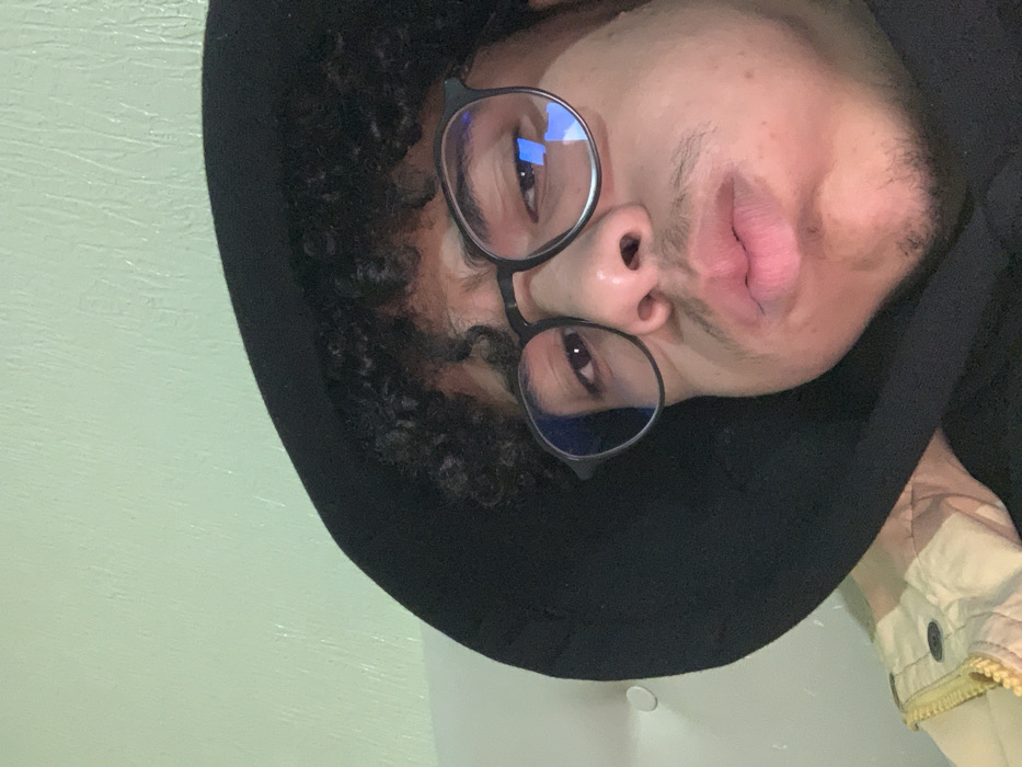A young man with dark curly hair and glasses looks toward the camera. He wears a black hooded sweatshirt, and part of a tan jacket is visible. His lips are pursed. The background is a light green wall and a white object. The image is rotated, giving a slightly skewed perspective.