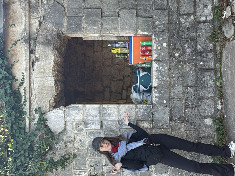 The image displays a young female subject standing outdoors against a weathered stone wall, specifically located along the ancient fortifications in Kotor, Montenegro. The wall is constructed from grey, irregularly shaped stone blocks and features a recessed, rectangular opening with a rough stone archway. Green ivy clings to the upper section of the wall above this opening. The female, positioned on the left side of the frame, has long, dark hair, partially covered by a dark green baseball cap with a red emblem. She wears red over-ear headphones, a black long-sleeved top, a grey sweater draped over her shoulders, black flared pants, and white athletic shoes. A black fanny pack is worn diagonally across her chest, with a set of keys attached. She holds a smartphone in her left hand and gestures with her open right hand, palm facing forward, towards the recess in the wall. Her gaze is directed at the camera. Within the stone recess, a makeshift vendor setup is visible on a stone ledge. An orange and white hard-sided cooler occupies the right side of the ledge. On top of the cooler, three plastic bottles (two clear water bottles, one yellow-labeled bottle) and a rectangular chocolate bar are arranged. To the left of the cooler, six aluminum beverage cans are lined up on the ledge: three red Coca-Cola cans, two orange Fanta cans, and one green Sprite can. Further left within the recess, a teal and grey soft-sided cooler bag and a white plastic shopping bag with a heart design are present. The ground in the foreground is a light-colored, rough path with sparse vegetation and small debris.