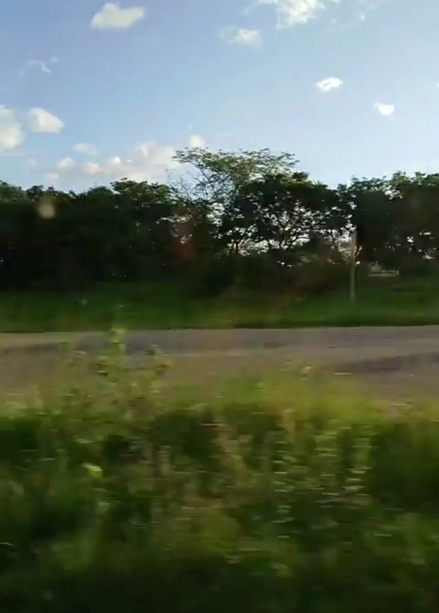 The video, shot from inside a moving vehicle, shows a road with grass on the sides and trees further away