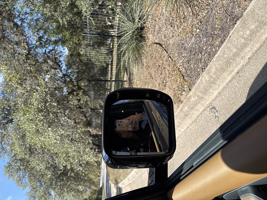 A side mirror of a vehicle reflects a selfie being taken by a person inside the car, with their phone visible in the mirror's reflection