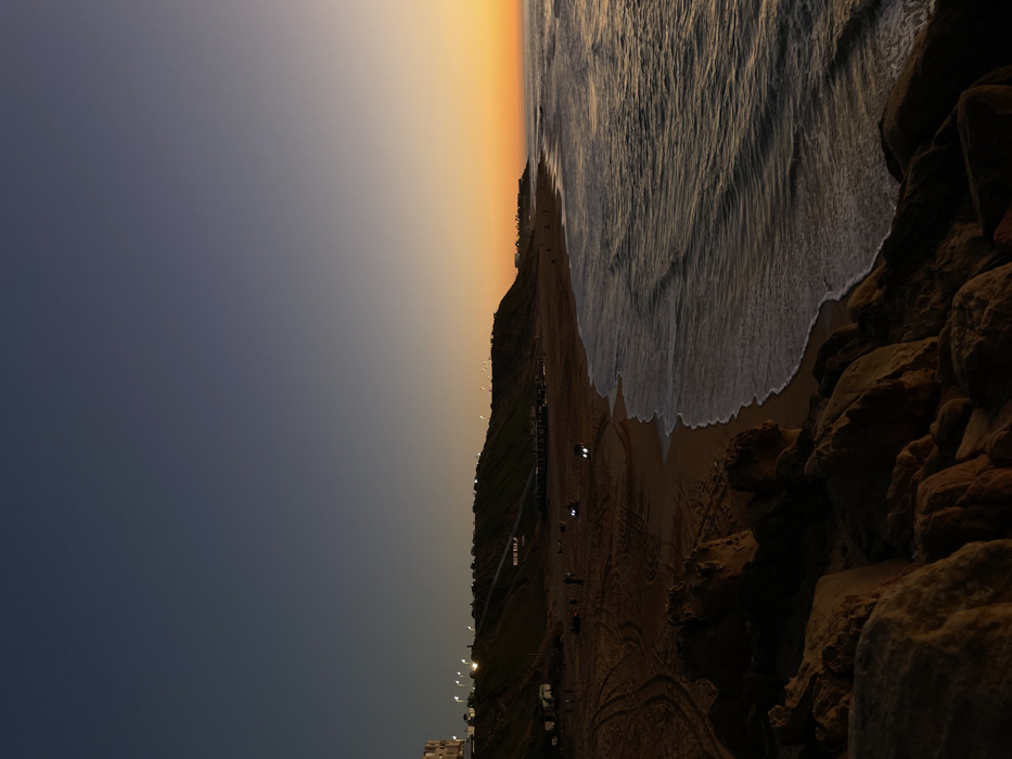 A beach scene at twilight. Waves gently lap the shoreline on the right, transitioning into a sandy beach marked with tire tracks. A road with illuminated streetlights runs parallel to the beach. The sky fades from a dark blue to an orange glow at the horizon. A rocky cliff face dominates the right foreground.