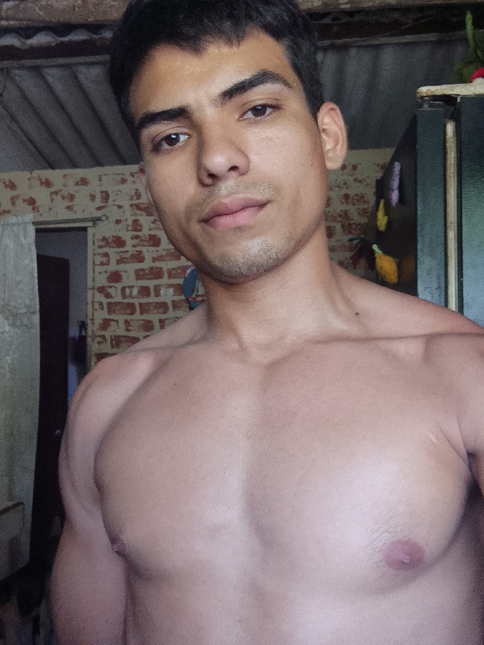 The image captures a young adult male, possibly in Juan Griego, Venezuela, from the upper torso upward, looking directly into the camera. He possesses short, dark hair, dark eyes, and a neutral expression. The male is shirtless, displaying a muscular physique in his chest and shoulders. The background on the left features a light-colored brick wall and a doorway with a light-colored curtain or fabric hanging, leading to a darker interior. On the right, a dark, vertical object, consistent with a refrigerator or cabinet, is visible with several colorful, indistinct objects affixed to its side. Above, a rustic ceiling structure with exposed wooden beams is discernible.