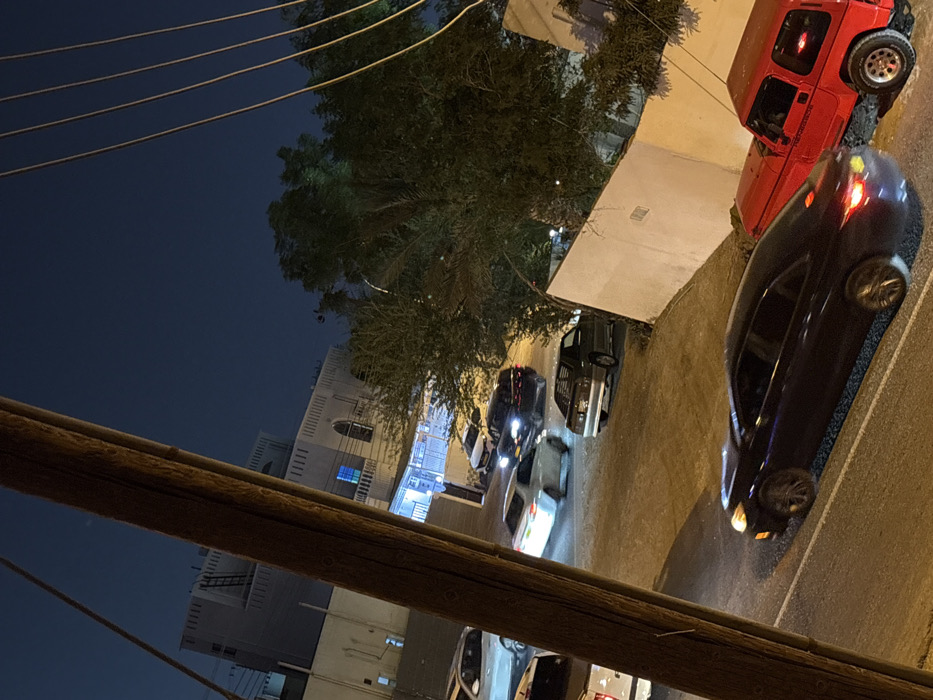 The image depicts an elevated view of a street at night in al Amerat Province, Oman