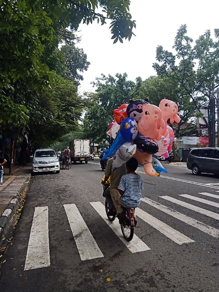 A man rides a motorcycle across a zebra crossing, carrying a large bunch of colorful character balloons. A child is riding pillion. They are on a street lined with trees and sidewalks. Vehicles, including cars, a truck, and a bicycle, are on the road in the background. The sky is overcast.