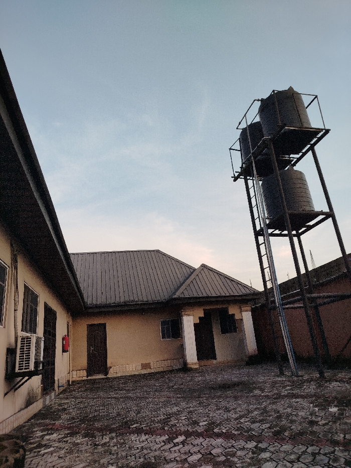 The image displays an outdoor compound area in Port Harcourt, Nigeria, under a light blue sky with scattered thin clouds