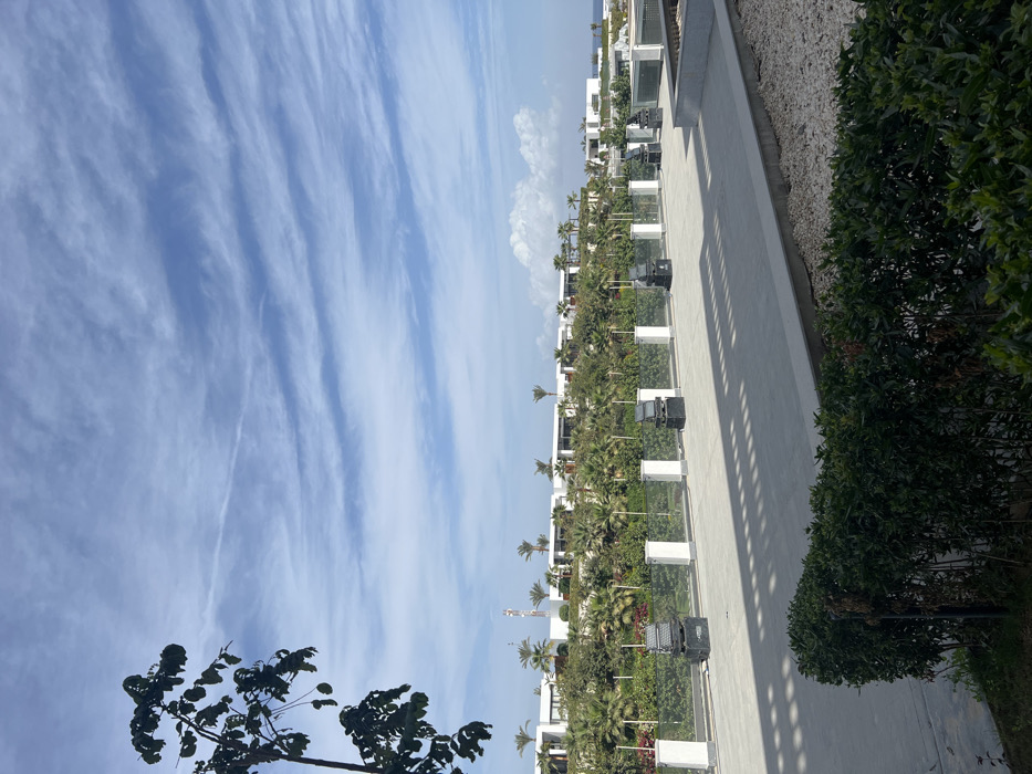 The image depicts an outdoor panoramic view of a resort or residential complex in the city of Unknown, Egypt, under a bright, partly cloudy blue sky. In the immediate foreground, dark green hedges are visible. Directly behind these, a light-colored concrete patio or terrace extends across the mid-ground. Parallel shadows, consistent with an overhead pergola or trellis structure, are cast across the patio from the left. Five black, rectangular outdoor floodlights or stage lights are positioned on the patio, spaced along a white-pillared barrier topped with clear glass panels. Beyond this barrier, a sloping, meticulously landscaped garden features numerous palm trees and other green shrubs and trees, terraced up a hillside. Several modern, white buildings with flat roofs, indicative of hotel units or villas, are integrated into the lush hillside vegetation. On the far left of the hillside, a slender red and white communication tower is visible. A faint blue line on the far right horizon suggests the presence of the sea. No individuals are present in the scene.